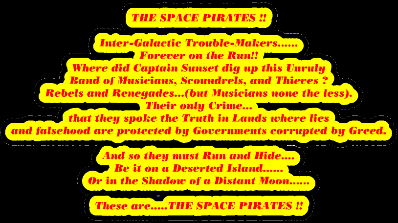Hot off the press... 'JUNGLE JANE' (designed for Film Score or Dance Club). Sunset sang the lead vocals and played the synth while the rest of the Space Pirates slept off the cheap Jamaican rum.